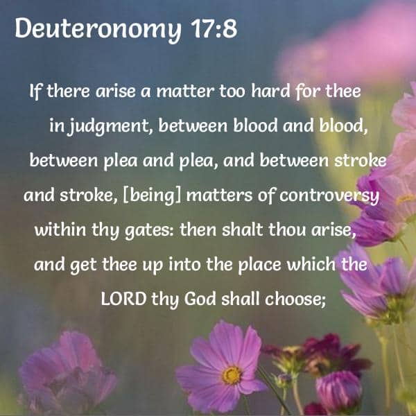 If there arise a matter too hard for thee in judgment, between blood and blood, between plea and plea, and between stroke and stroke, [being] matters of controversy within thy gates: then shalt thou arise, and get thee up into the place which the LORD thy God shall choose;