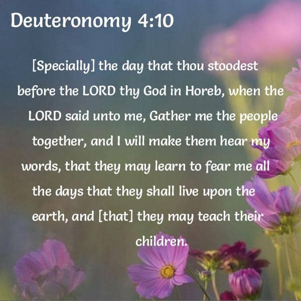 [Specially] the day that thou stoodest before the LORD thy God in Horeb, when the LORD said unto me, Gather me the people together, and I will make them hear my words, that they may learn to fear me all the days that they shall live upon the earth, and [that] they may teach their children.